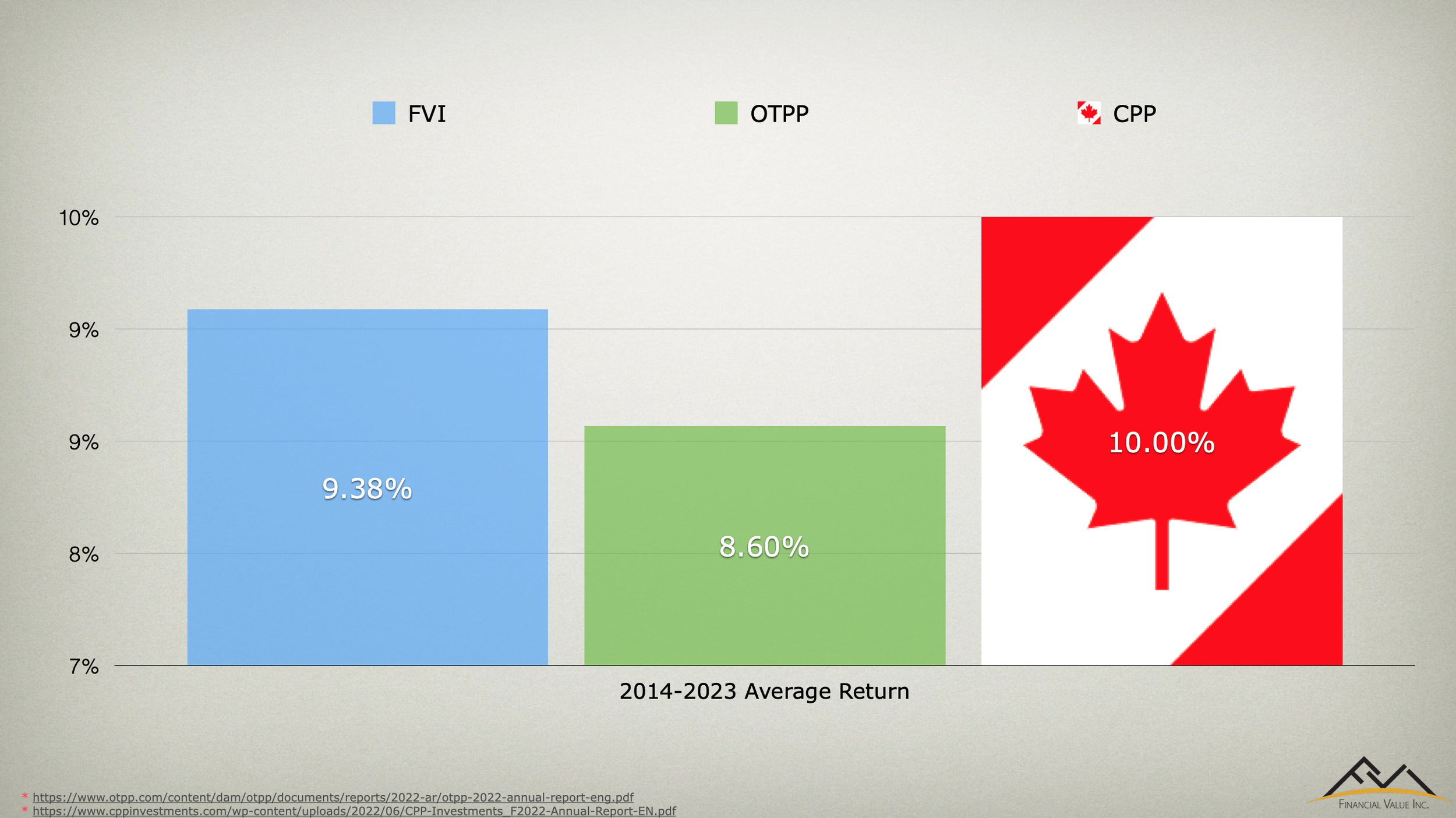 Can I plug FVI for a moment? We compete returns wise with CPP and OTPP. We study them and try to copy what they are doing. Below are the average returns of CPP, OTPP and Financial Value’s overall portfolio. While your experience with us may differ, I can tell you, the investors who regularly spend time with us and are on top of their money are working at this level.